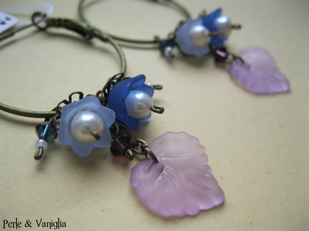 Cerchi tono bronzo antico, con una piccola cascata di charms a renderli vivaci e colorati! In questo caso foglie e fiori in plastica (o lucite, ancora devo capire....!), perle di fiume, coppette filigranate, cristalli Swarovski e perline di conteria!